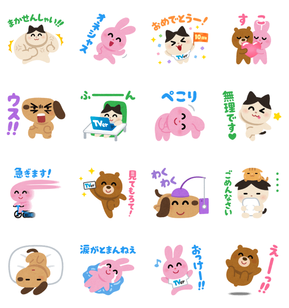 期間限定スタンプ TVer, イヌ, いらすとや, ウサギ, おもしろ, クマ, コラボ, テレビ, ネコ, ハイテンション, みふねたかし, 動物, 動画配信, 友だち追加, 限定無料スタンプ, 陽キャ