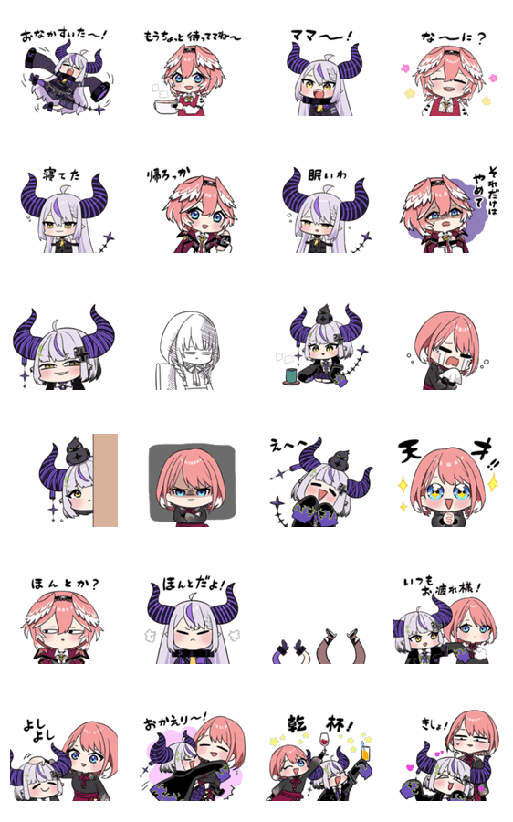 ホロライブ公式スタンプとして、ホロライブプロダクション所属の「ラプラス・ダークネス」と「鷹嶺ルイ」のコンビLINEスタンプが登場! イラスト:ちょぼらうにょぽみ