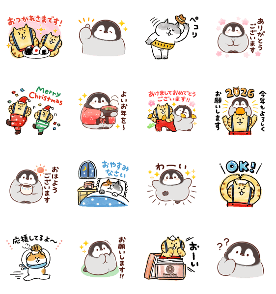 大人気「ごろごろにゃんすけ」と「もふペンギン」の期間限定コラボスタンプが新登場!年末年始に使えるスタンプから、毎日使えるスタンプまでたっぷり全16種類☆パーフェクトワン公式アカウントと友だちになるともらえるよ♪配布期間:2026/01/05まで