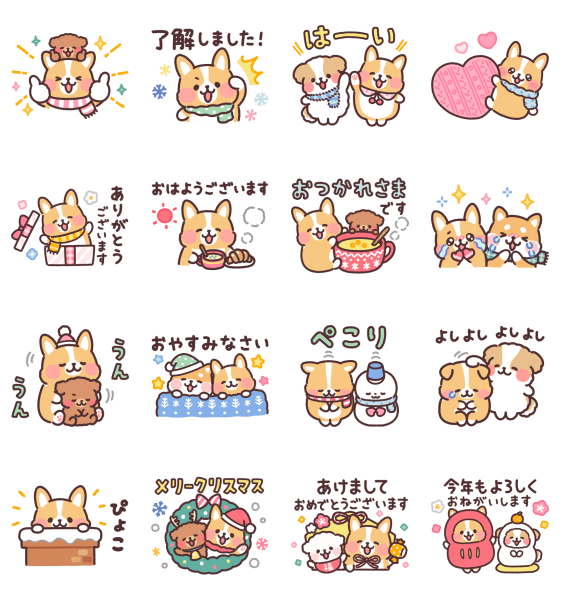 大人気まるまるコーギーとコラボ!トイプードルや柴犬などたくさんのわんこも一緒♡日常使いからクリスマスやあけおめなど冬イベントにもぴったり♪丁寧な敬語&やさしい表現で気持ちを伝えよう★LINEバイト公式アカウントと友だちになるともらえるよ!配布期間:2026/01/14まで