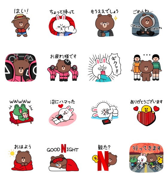 期間限定スタンプ LINEフレンズ, LYPプレミアム, Netflix, イカゲーム, かわいい, コニー, コラボ, サブスク, ストレンジャーシングス, パロディ, ブラウン, ワンピース, 動画配信, 友だち追加, 限定無料スタンプ